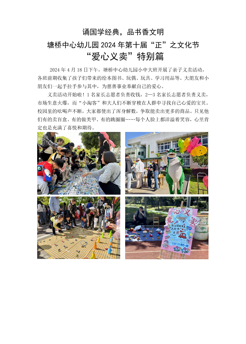 诵国学经典,品书香文明 塘桥中心幼儿园 2024 年第十届“正”之文化节 “爱心义卖”特别篇 来源: 发布时间:2024-05-20 14:26:23 浏览次数: 次 【字体:小 大】 分享到: 【打印正文】